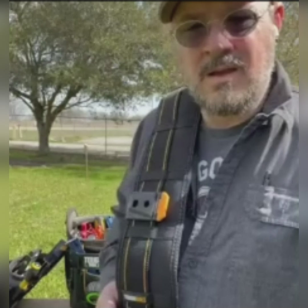 Wide padding evenly distributes heavy loads for maximum comfort during long workdays. Rugged 6-layer construction with rivet reinforcements at pressure points.