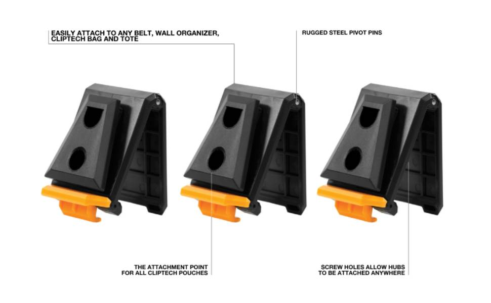 The ClipTech™ Hubs provide a secure, quick-release attachment system for your ToughBuilt pouches, bags, holsters, and wall organizers. Each hub fastens to belts, bags, or fixed surfaces with screws, enabling you to customize tool organization for any task. Once mounted, the rugged steel pivot pins lock accessories firmly in place, while the quick-release mechanism allows you to detach and switch gear instantly. This modular system ensures you carry only the tools you need and can reconfigure your setup as the job changes, boosting both efficiency and comfort.